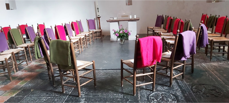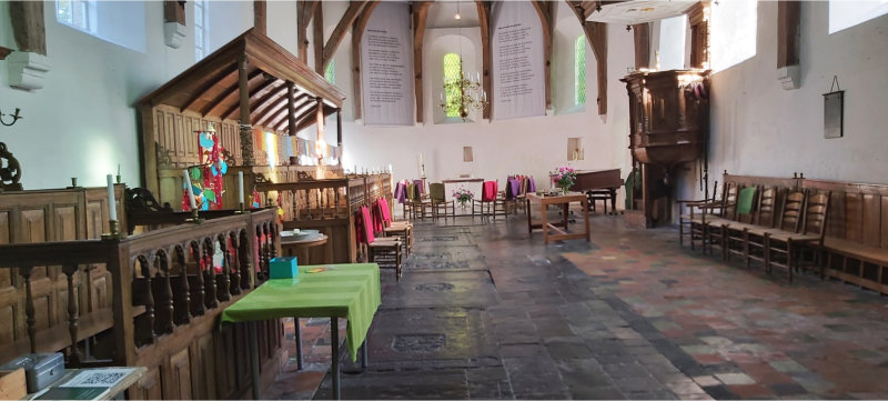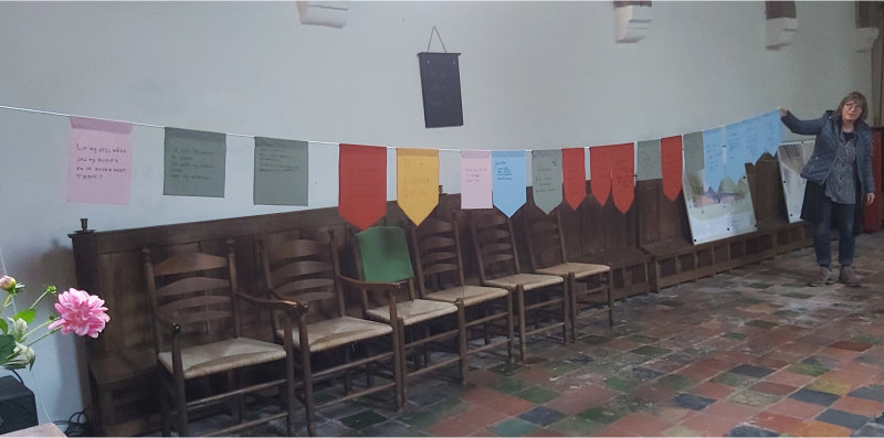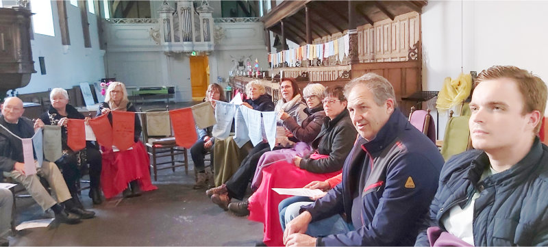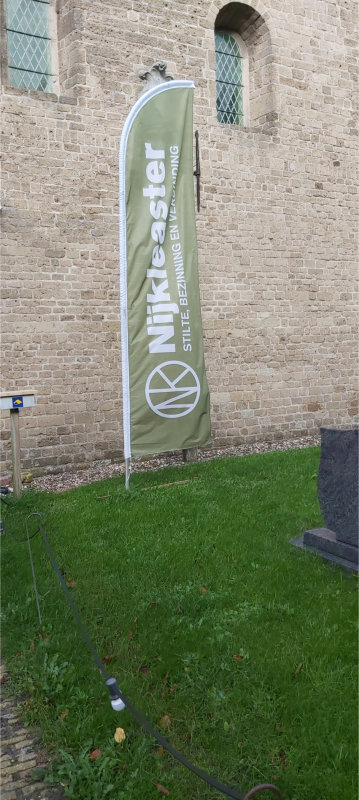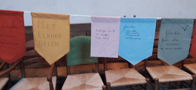 Na een mooie middag met uitleg over Nijkleaster, een wandeling in de omgeving en bezig zijn met persoonlijke gebeden, schreef iedereen een korte gebedsuitspraak op een vlaggetje. Het koord met vlaggetjes is meegegaan naar Twijzel.