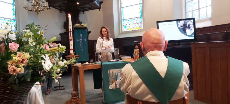 Tijdens de dienst werd Thijs toegesproken door zijn dochter Ester en door Gert. Ook werd hem een cadeau overhandigd: een vogelhuis voor in zijn nieuwe tuin.