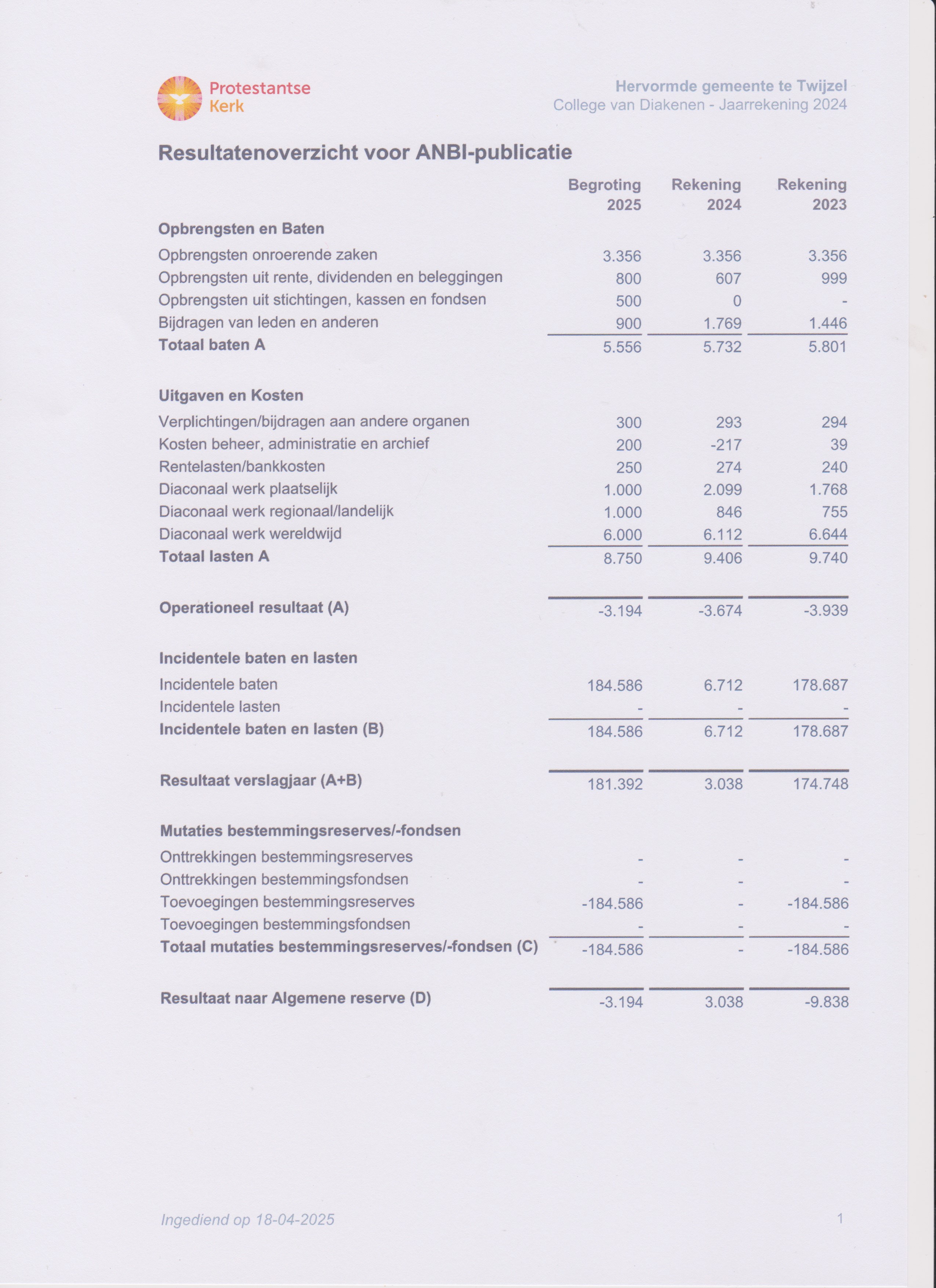 Onderstaande staat van baten en lasten geeft via de kolom Begroting inzicht in de begrote ontvangsten en de voorgenomen bestedingen in het verslagjaar. De kolom Rekening geeft inzicht in de daadwerkelijk gerealiseerde ontvangsten en bestedingen.