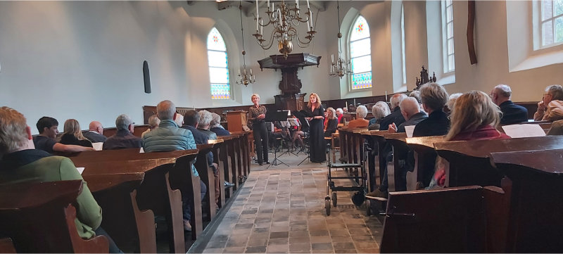 Het was een gevarieerd programma met liederen van o.a. Bach. Mozart en Purcell. Het koor werd begeleid door een klein orkest. Gretha Hoekstra en Baukje Toren zongen een paar mooie duetten.