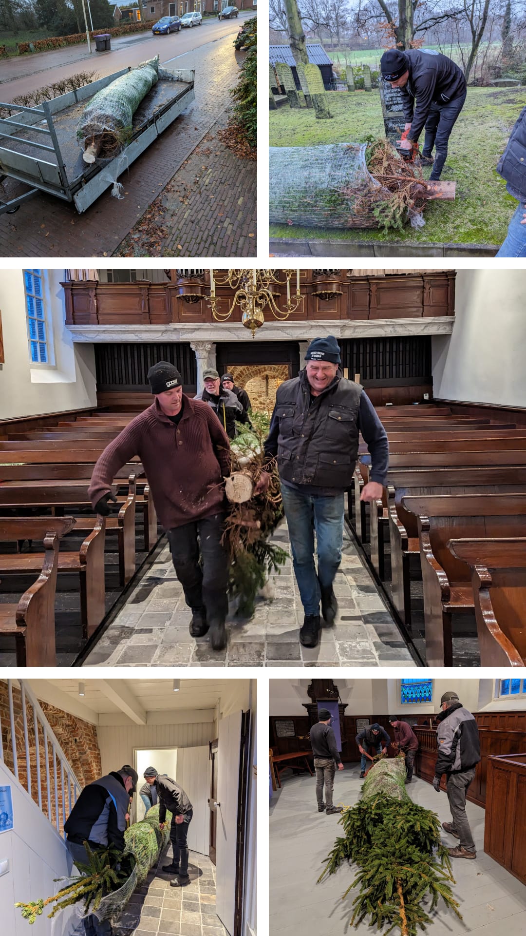 Met behulp van een aantal sterke mannen werd de metershoge boom de kerk ingesjouwd.