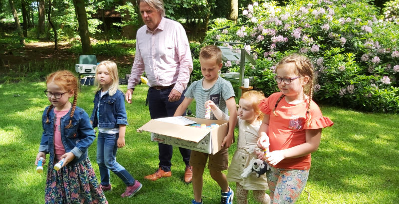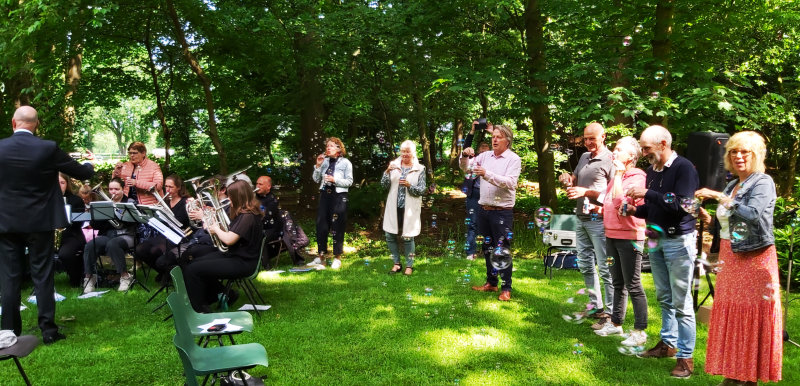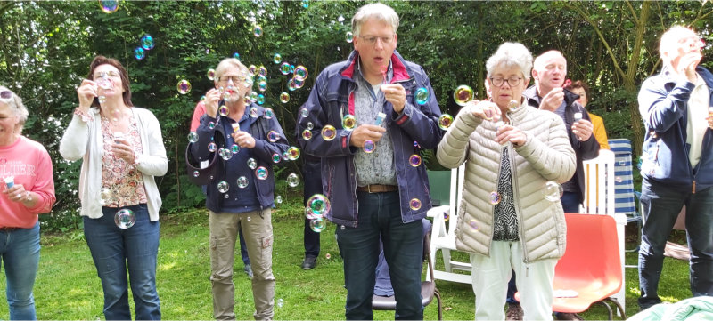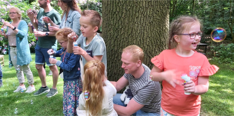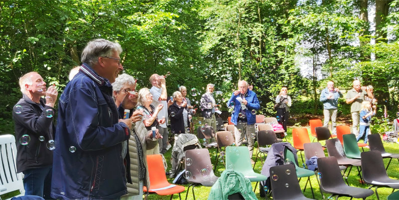 Na de verkondiging, waarin het onder andere over lucht en blazen ging, werd er door de aanwezige kinderen een bellenblaas aan iedereen uitgedeeld. Zodat we samen, de leden van de Brassband op hun instrumenten en de gemeenteleden met de bellenblaas, konden 'blazen'.