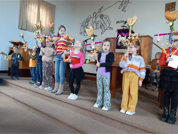 Ook dit jaar werden er weer Palmpasenstokken gemaakt tijdens de dienst op Palmpasen.