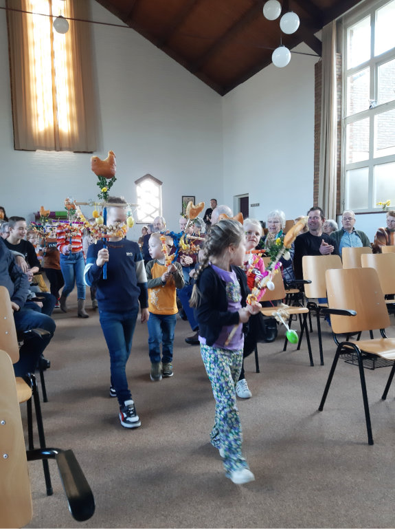 Aan het einde van de dienst liepen de kinderen in optocht door de kerk en lieten hun prachtig versierde Palmpasenstokken zien.