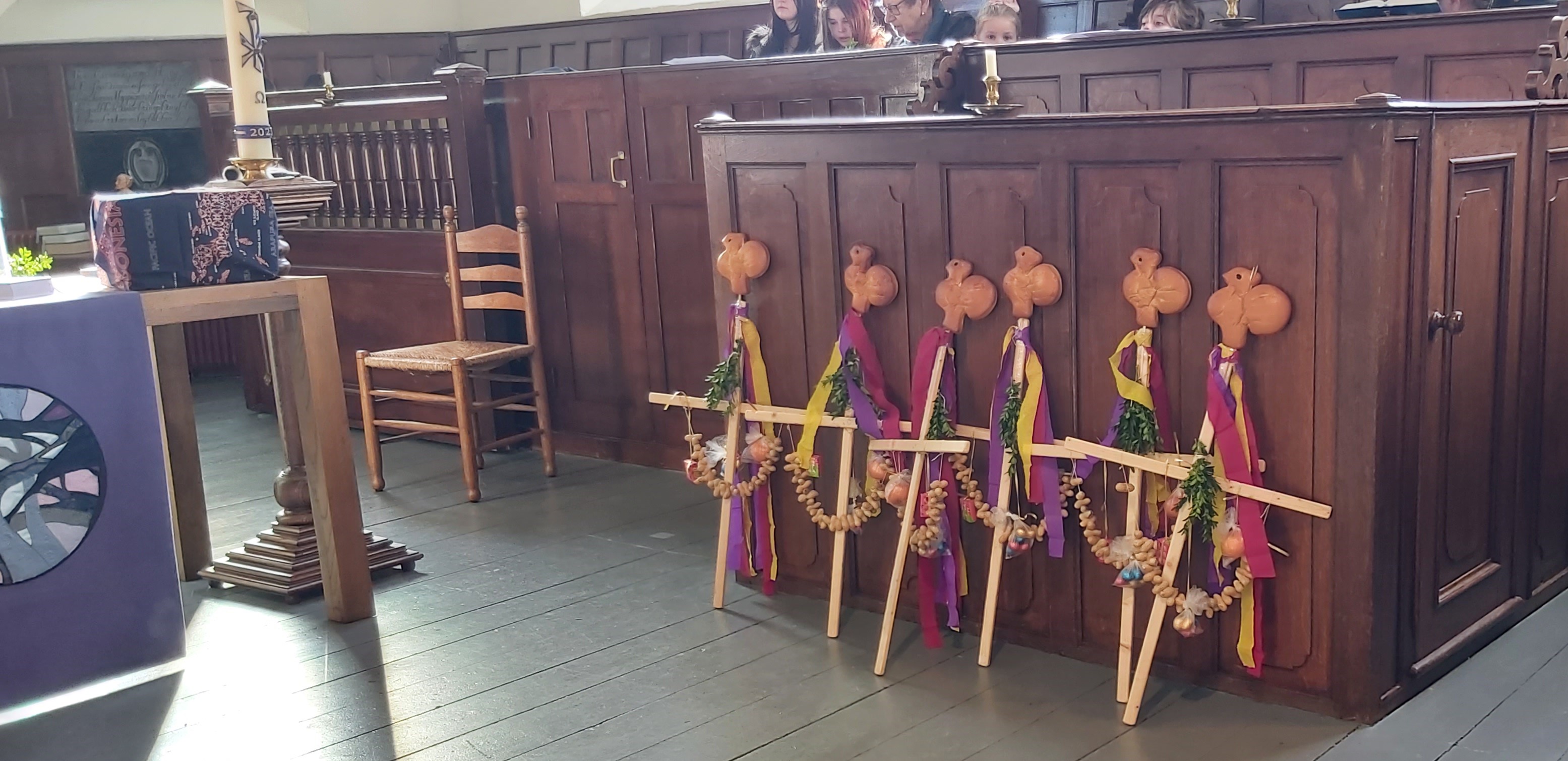 We vierden Palmpasen. De dienst begon in het lokaal. Daarna gingen we in optocht naar de kerk.