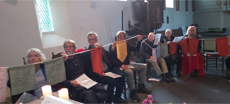 Na een mooie middag met uitleg over Nijkleaster, een wandeling in de omgeving en bezig zijn met persoonlijke gebeden, schreef iedereen een korte gebedsuitspraak op een vlaggetje. Het koord met vlaggetjes is meegegaan naar Twijzel.
